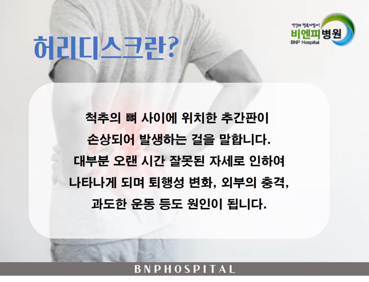 대전 유성 통증의학과 허리디스크 원인 알아보기 안녕하세요.비엔피병원입니다. 허리디스크는 척추의 뼈 사이에 위치한 추간판이손상되어 발생하는 것을 말합니다. 대부분 오랜 시간 잘못된 자세로 인하여 나타나게 되며퇴행성 변화, 외부의 충격, 과도한 운동 등도 원인이 됩니다. 허리디스크의 원인은 다음과 같습니다. 1. 무리한 운동으로 인한 허리 부상2. 사고에 의한 허리 충격3. 잘못된 자세 습관으로 인한 척추 틀어짐4. 노화로 인한 허리 디스크 허리디스크 검사 및 진료가 가능한 비엔피병원입니다. 유성온천역 5번출구 방면에 위치하고 있습니다.맥도날드 대전유성DT점 옆에 위치하고 있습니다. 비에피병원의 단독건물을 확인하세요. 주차의 경우 병원의 뒷편..