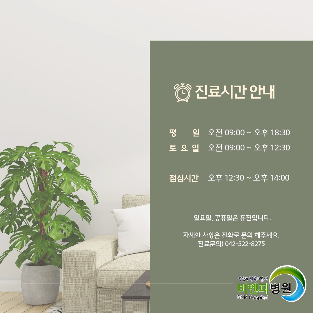 비엔피병원의 진료시간, 점심시간을 미리 확인하세요.